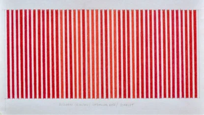 Study 1: Three Colours (Red) (Alizarin Crimson, Cadmium Red, Scarlet): The use of three colours, as in this example, produces a colour shift by one factor. In this instance, alizarin crimson (the first colour) begins the sequence, but cadmium red (the second colour) completes it. As one colour decreases in frequency, the following colour increases, producing an overlap. For how long would the cycle need to be repeated before being able to end with the first colour?